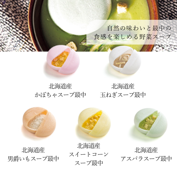 さくさく食感が楽しい最中と自然の味わいを楽しめる野菜スープ。パッケージを開けると、コロンとしたフォルムが可愛い、パステルカラーの最中が顔を覗かせます。「北海道産かぼちゃ」「北海道産玉ねぎ」「北海道産男爵いも」「北海道産スイートコーン」「北海道産アスパラ」の5種類を詰め合わせました。見た目も味も楽しめるスープセットです。