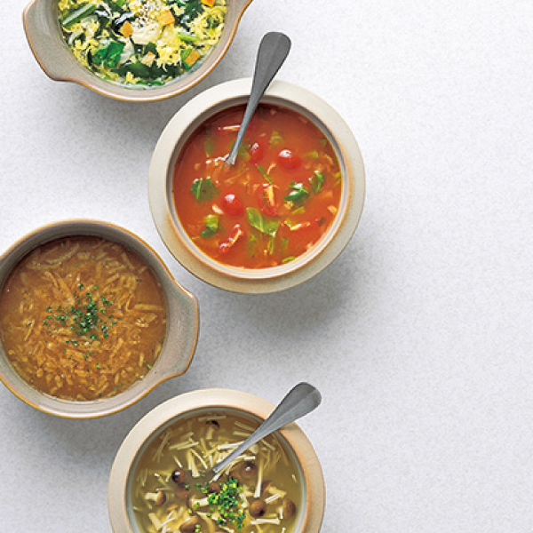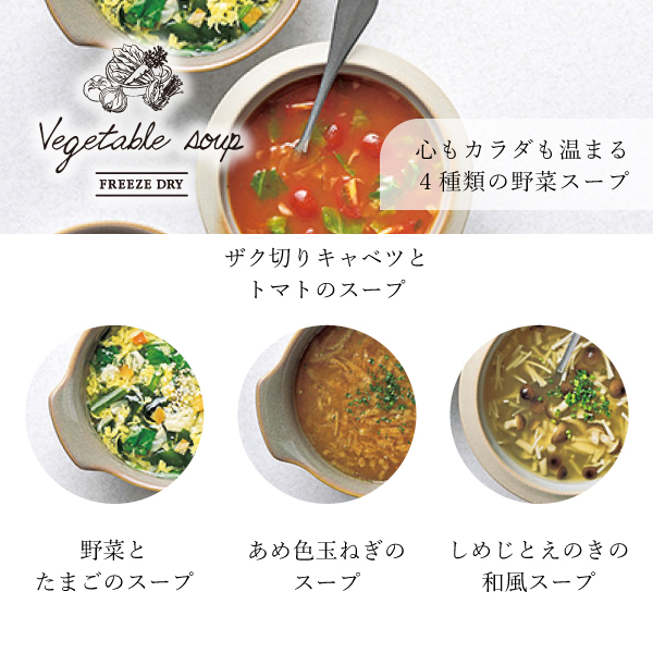 | 内容 | ザク切りキャベツとトマトのスープ×3、あめ色玉ねぎのスープ×3、野菜とたまごのスープ×3、しめじとえのきの和風スープ×3 |