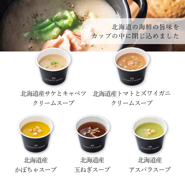 北海道の美味しいスープをおしゃれなパッケージでお届けします。カップの中に閉じ込めた北海道の野菜と海鮮の旨味を手軽に楽しめる、嬉しい豪華なスープセットです。美味しいスープで心も体もぽかぽかに。手土産にも人気のギフトです。カップ付きなのでお弁当のお供など外出先でも手軽に楽しめる便利なセットです。