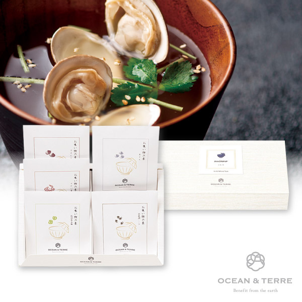 北海道産真昆布を使用し、海鮮で深い旨味を加えた、潮風を感じるお吸い物です。「はまぐり」「ずわい蟹」「紀州南高梅」「あさり」「宍道湖しじみ」の5種類の詰め合わせ。セットの白煎りごまを振れば、さらに違った味わいをお楽しみいただけます。