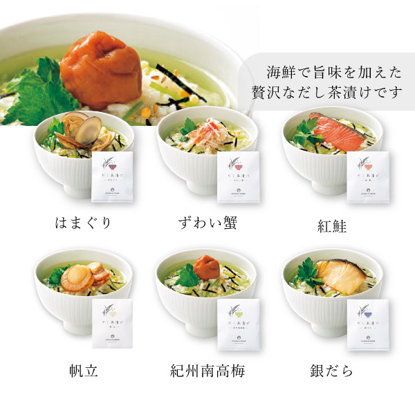 北海道産真昆布を使い、静岡県産抹茶の風味を利かせた、贅沢なだし茶漬けのセットです。「はまぐり」「ずわい蟹」「紅鮭」「紀州南高梅」「帆立」「銀だら」の6種類のだし茶漬けの詰め合わせ。家族や夫婦みんなで絶品のだし茶漬けを味わえるのはもちろん、お一人暮らしの方にも食べ比べを楽しんでいただけるギフトです。