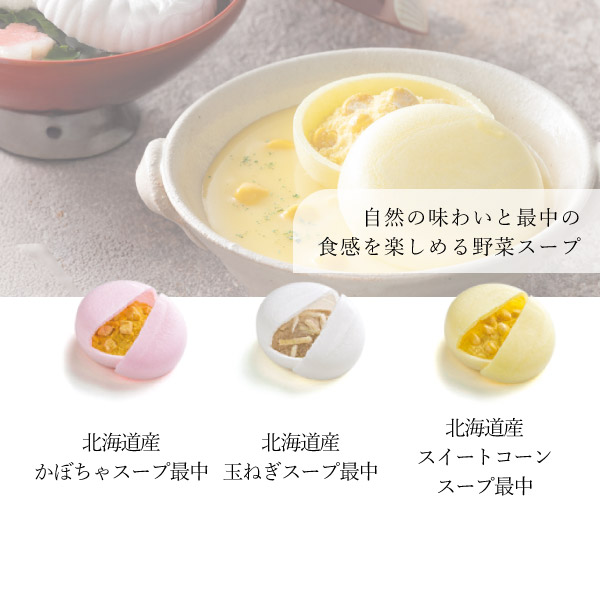 見た目だけでなく食感も楽しめる最中の詰め合わせセットです。最中は国産100%のもち米から作られており、だしや野菜スープにも国内素材を使用しております。