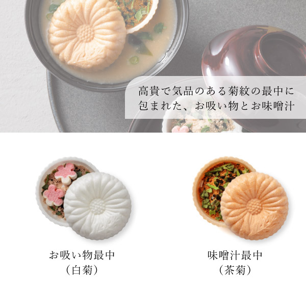 | 内容 | お吸い物最中(白菊)7.3g×2、味噌汁最中(茶菊)10.5g×1、北海道産かぼちゃスープ最中20.7g×1、北海道産玉ねぎスープ最中11.2g×1、北海道産スイートコーンスープ最中20.7g×1、最中(だし味噌汁の素 合わせ)11.7g×2、最中(だし味噌汁の素 赤)11.7g×1 |