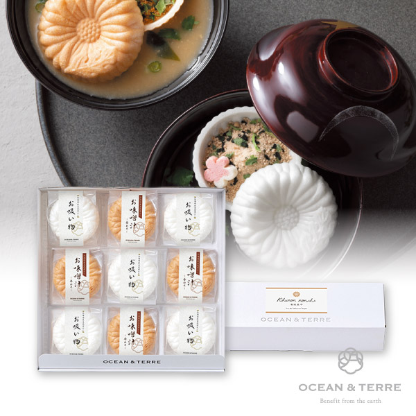 高貴で気品のある菊紋の最中に包まれた、お吸い物とお味噌汁を詰め合わせました。