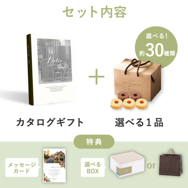 人気のカタログギフトや品物ギフトにプラス1品の食品ギフトをセットにした、お返しに人気のギフトセットです。写真が入るオリジナルメッセージカード、手渡しに便利なバッグorギフトボックスがついた便利なギフトセット。香典返しや法事用のお返しなどの様々なギフトシーンでご利用いただけます。