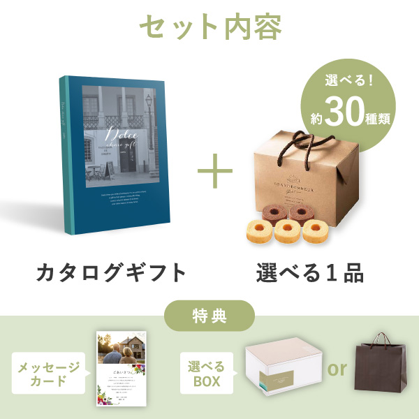 人気のカタログギフトや品物ギフトにプラス1品の食品ギフトをセットにした、お返しに人気のギフトセットです。写真が入るオリジナルメッセージカード、手渡しに便利なバッグorギフトボックスがついた便利なギフトセット。香典返しや法事用のお返しなどの様々なギフトシーンでご利用いただけます。