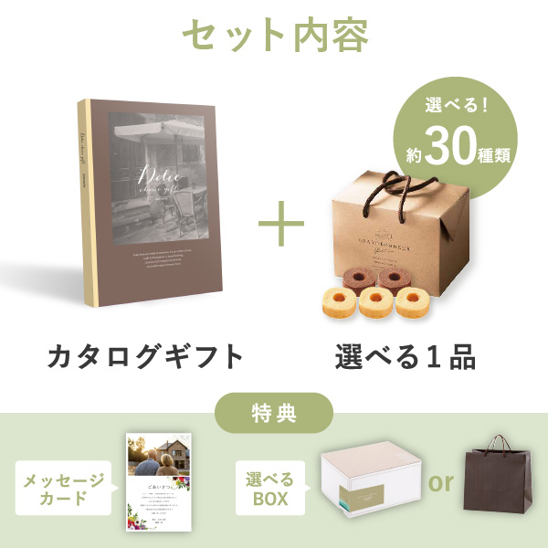 人気のカタログギフトや品物ギフトにプラス1品の食品ギフトをセットにした、お返しに人気のギフトセットです。写真が入るオリジナルメッセージカード、手渡しに便利なバッグorギフトボックスがついた便利なギフトセット。香典返しや法事用のお返しなどの様々なギフトシーンでご利用いただけます。
