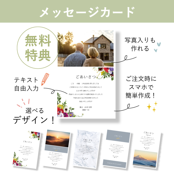 写真が入るオリジナルメッセージカード、手渡しに便利なギフトバッグorギフトボックスが選べる便利なギフトセット。香典返しや法事用のお返しなどの様々なギフトシーンでご利用いただけます。