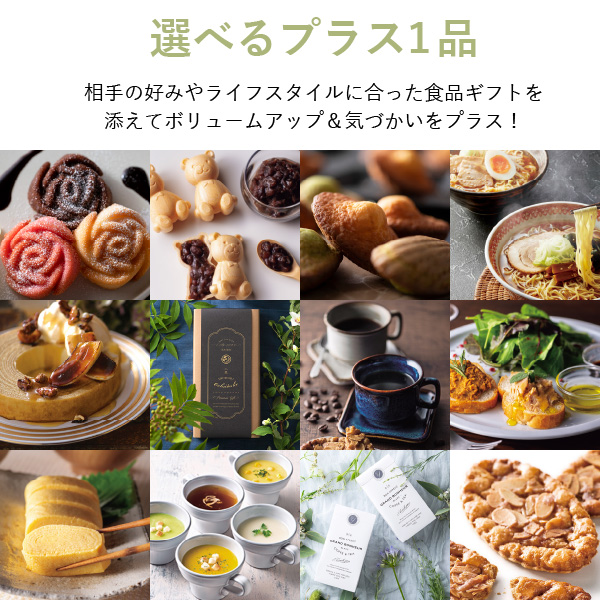 プラス1品のギフトには、お子さまも喜ぶフルーツゼリー、女性に人気のおしゃれな焼き菓子、幅広い層の方に喜ばれるご飯のお供など、たくさんご用意しております。