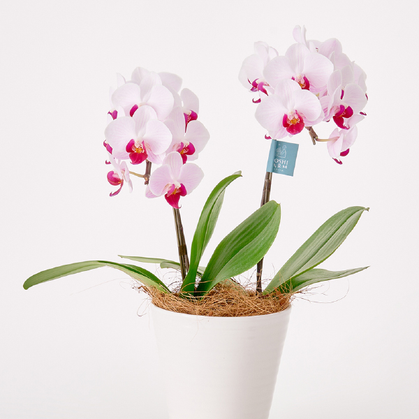 山口県柳井市で丁寧に育てられた、お祝、記念日におすすめのミディ胡蝶蘭です。お花の真ん中の鮮やかな赤が可愛らしいミディ胡蝶蘭を、インテリアに映える程よい大きさに仕立てています。ギフトシーンを可憐に彩ります。