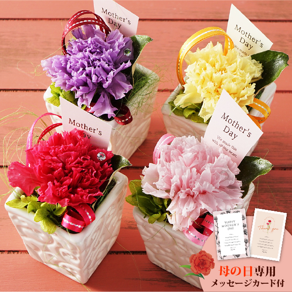 母の日に贈りたいカーネーションのプリザーブドフラワーを、バリエーション豊かに揃えました。お母さんにも、お義母さんにも、どなたに贈っても喜ばれるでしょう。