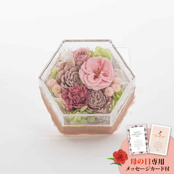 透明感のあるきれいな六角形のアクリルケースに落ち着いた大人色のアレンジで仕上げました。