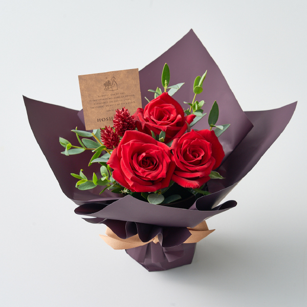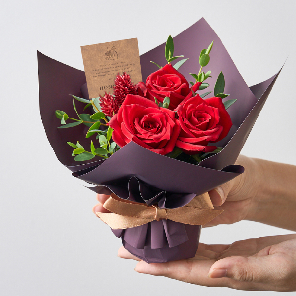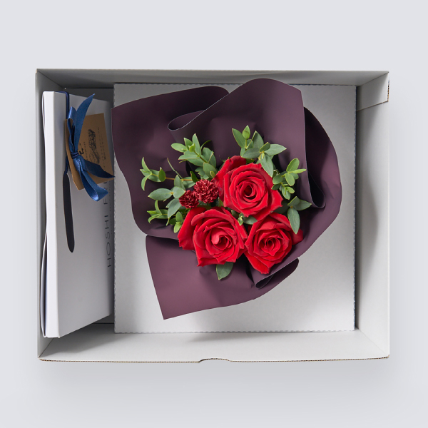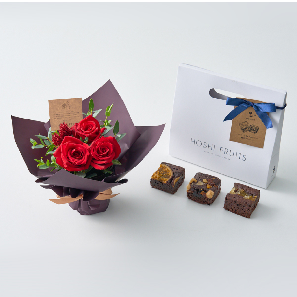 濃厚なチョコレートの生地に、香ばしいナッツや甘酸っぱいフルーツをトッピングした贅沢ブラウニー3個と、深紅の花色が華麗な赤バラ「サムライ08」を使ったミニアレンジメントをセットにしてお届けします。