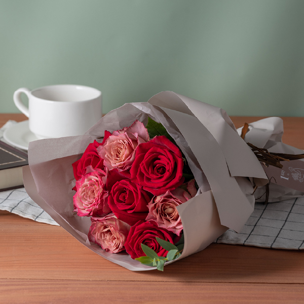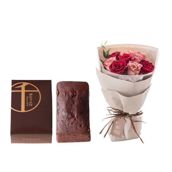 バラブーケとブランドスイーツのコンビギフトです。艶やかなベルベットのような深紅のバラ・サムライと、シックな花色の変化が美しい「テナチュール」を組み合わせたフリルブーケ。華やかさとアンティークな雰囲気を合わせ持つ豊かな表情が魅力です。まるでドレスをまとったようなふわりと重ねたフリルがかわいいラッピングでお届けします。また、ブーケと一緒に、いよかんを生地に練り込んだ銀座千疋屋チョコパウンドケーキをセットにしました。柑橘類独特の酸味と芳醇な香りがチョコレートの甘さを引き立てます。大切な方の記念日に、想いを伝えたい時におすすめです。