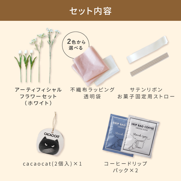 | 内容 | 【お菓子】 ・選べるチョコAコース(CACAOCAT 2個入り)×1個 ・選べるコーヒーAコース(コーヒードリップパック)×2枚 【ブーケキット】 ・アーティフィシャルフラワーセット(ホワイトチューリップ系)×1 ・不織布ラッピング(約65×65cm)×1 ※2色からお好きなものをお選びいただけます。 ・サテンリボン アイボリー(幅38×長さ100mm)×1 ・透明袋×1 ・お菓子固定用ストロー×8 【製作時ご用意いただくもの】 ・麻ひも(輪ゴムで代用も可) ・テープ(マスキングテープも可) ・ニッパー(花材を切るため) 【あると便利なもの】 ・ホチキス(ラッピングを留めるため) ・マスキングテープ (セロテープの上に貼って可愛くするため) 【作り方】 作成動画を見る |