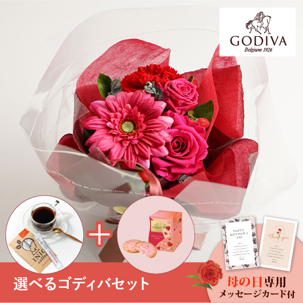 そんな気持ちを形にする母の日に人気のお花と、選べるGODIVAクッキー&選べるイニックコーヒーのギフトセットです。おしゃれなオリジナルのメッセージカード付き。