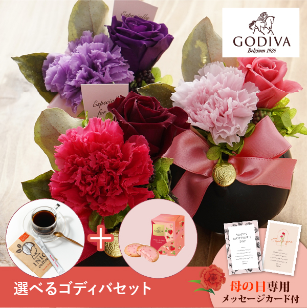 そんな気持ちを形にする母の日に人気のお花と、選べるGODIVAクッキー&選べるイニックコーヒーのギフトセットです。おしゃれなオリジナルのメッセージカード付き。