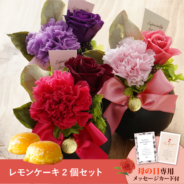 そんな気持ちを形にする母の日に人気のお花と、菓子工房さっちんとコラボしたレモンケーキのギフトセットです。おしゃれなオリジナルのメッセージカード付き。