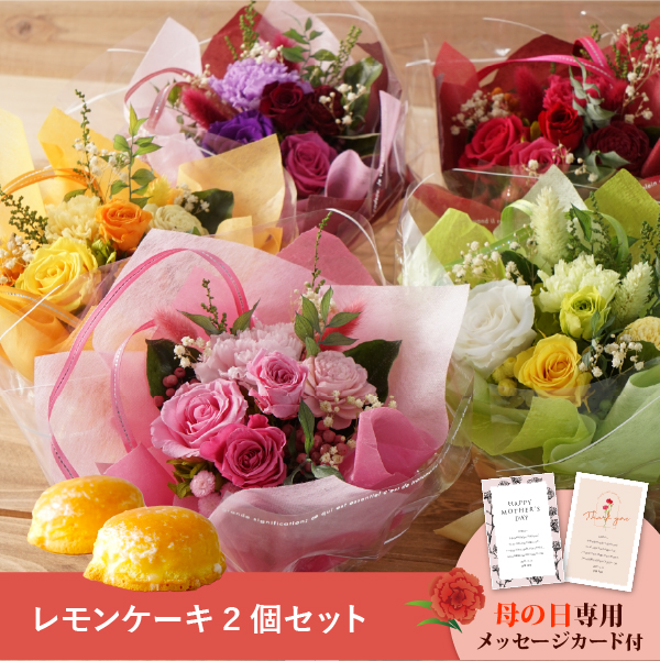 そんな気持ちを形にする母の日に人気のお花と、菓子工房さっちんとコラボしたレモンケーキのギフトセットです。おしゃれなオリジナルのメッセージカード付き。