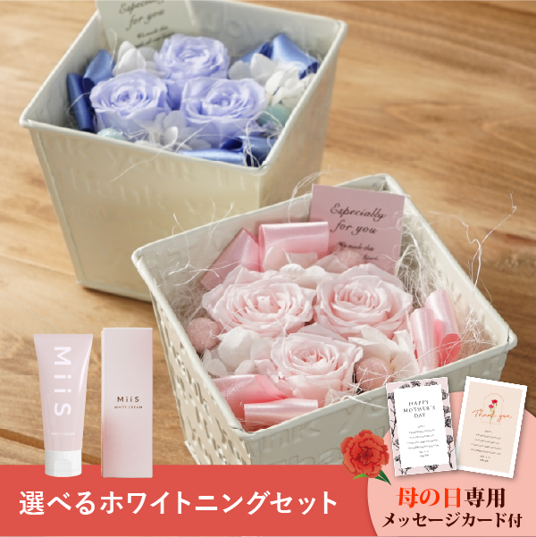そんな気持ちを形にする母の日に人気のお花と、ホワイトニングクリームのギフトセットです。おしゃれなオリジナルのメッセージカード付き。