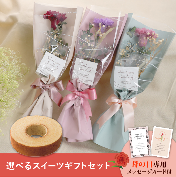 そんな気持ちを形にする母の日に人気のお花と、選べるスイーツのギフトセットです。おしゃれなオリジナルのメッセージカード付き。
