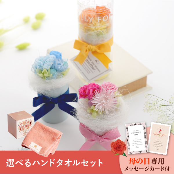 そんな気持ちを形にする母の日に人気のお花と、バラの花から抽出した染料で美しく染め上げたハンドタオルのギフトセットです。おしゃれなオリジナルのメッセージカード付き。