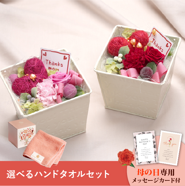 そんな気持ちを形にする母の日に人気のお花と、バラの花から抽出した染料で美しく染め上げたハンドタオルのギフトセットです。おしゃれなオリジナルのメッセージカード付き。