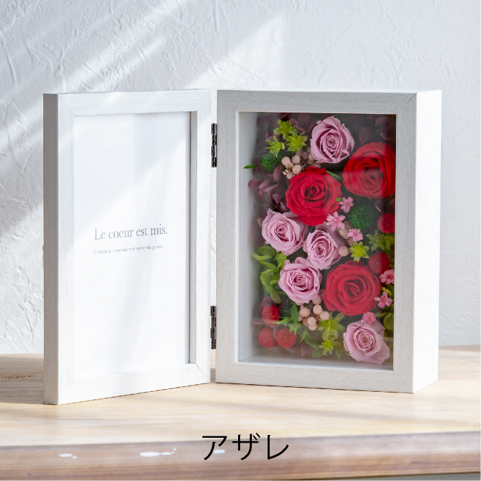 カードルリーヴルとは「本の額縁」の意。本のように開くと、華やかなローズが顔を覗かせます。左のメッセージカードは写真などに入れ替えてお楽しみいただけます。