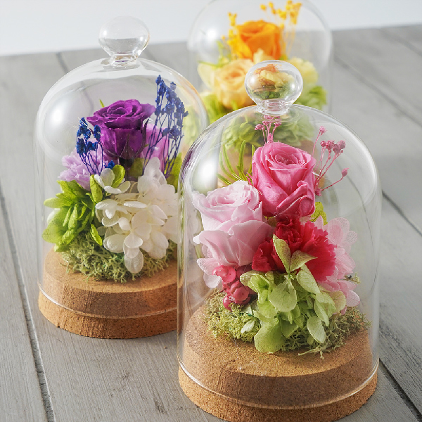 | 内容 | プリザーブドフラワー:ローズ、カーネーション、アジサイ、ペッパーベリー、他 ガラス、コルク |