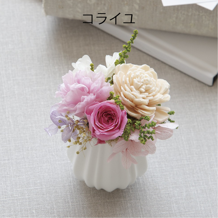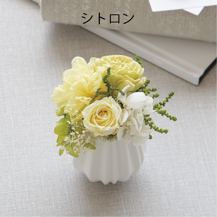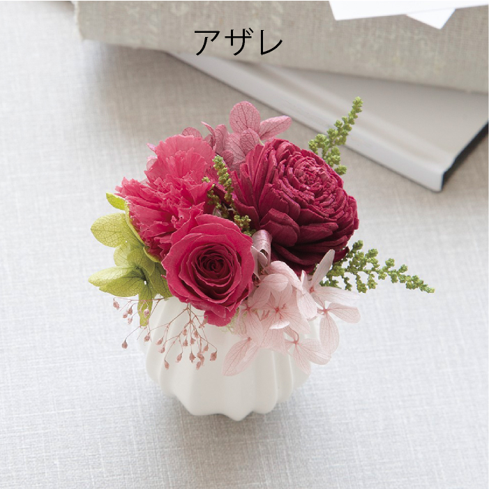 | 内容 | プリザーブドフラワー:ローズ、アジサイ、カーネーション、グリーン、他 ハンドメイドフラワー、陶製花器、クリアケース入り |