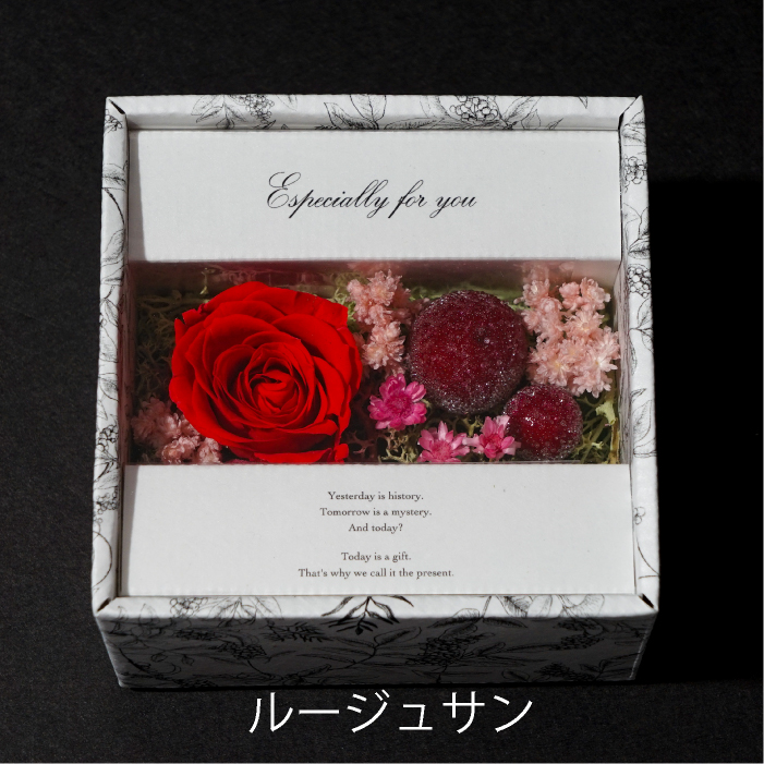 | 内容 | プリザーブドフラワー:ローズ、クリスパム、モス ドライフラワー、樹脂製オーナメント、容器:紙、フタ:PET |