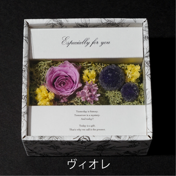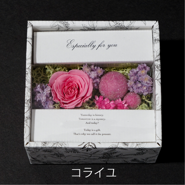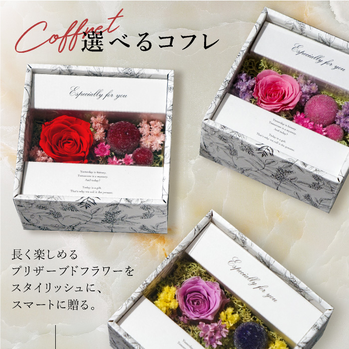 Coffret(コフレ)とはフランス語で「小箱」の意。ボタニカルが描かれた小箱に、愛らしい花々の世界をそっと閉じ込めました。ちょっとしたギフトや、贈り物に添えるお花として。