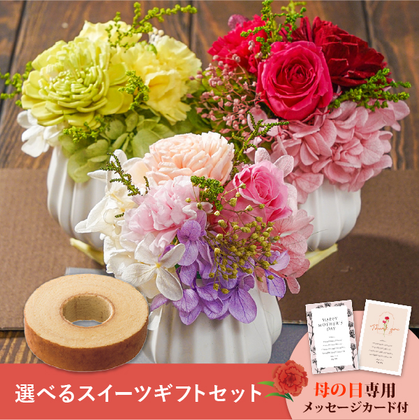 そんな気持ちを形にする母の日に人気のお花と、選べるスイーツのギフトセットです。おしゃれなオリジナルのメッセージカード付き。