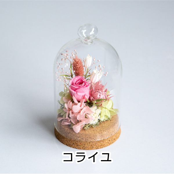 | 内容 | プリザーブドフラワー:ローズ、アジサイ、カスミソウ、他 ドライフラワー、ガラス、コルク |