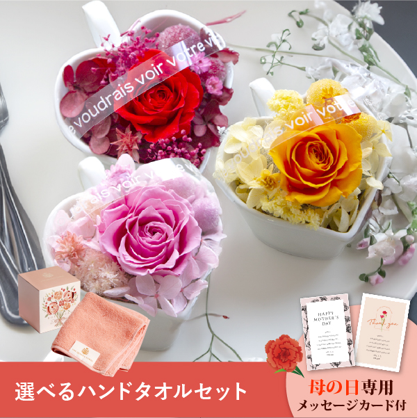 そんな気持ちを形にする母の日に人気のお花と、バラの花から抽出した染料で美しく染め上げたハンドタオルのギフトセットです。おしゃれなオリジナルのメッセージカード付き。
