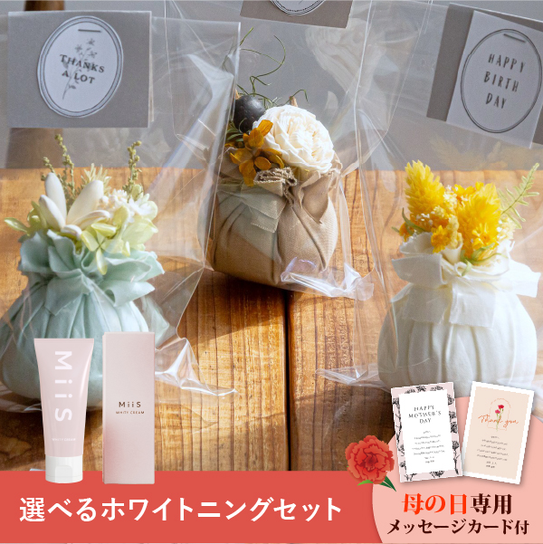 そんな気持ちを形にする母の日に人気のお花と、ホワイトニングクリームのギフトセットです。おしゃれなオリジナルのメッセージカード付き。