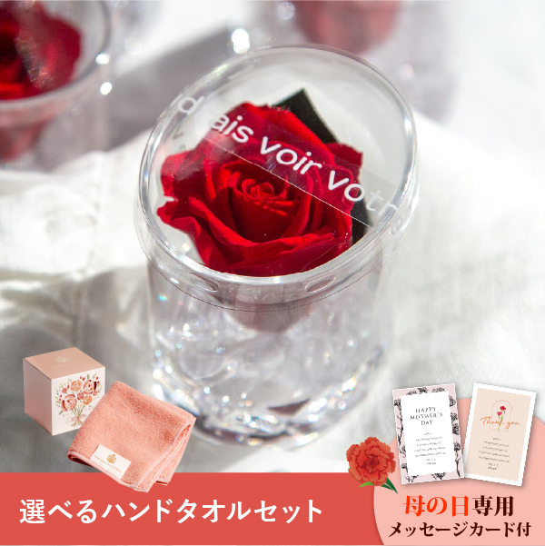 そんな気持ちを形にする母の日に人気のお花と、バラの花から抽出した染料で美しく染め上げたハンドタオルのギフトセットです。おしゃれなオリジナルのメッセージカード付き。