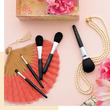 熊野筆は1975年に国の伝統的工芸品に指定され、その技術を生かした画筆や化粧筆など多様な筆が生産されています。特に近年では、化粧筆の品質の高さが国内外問わず評価されており、世界中の著名なメイクアップアーティストも多く愛用しています。一般的に販売されているメイクブラシは、根元の部分を揃えてから筆先をそれぞれの形にカットするので筆先の断面はシャープですが、熊野筆は、筆先をカットせずに自然な毛先を活かしたままで製造しているので、独特の柔らかな肌あたりを実現できます。