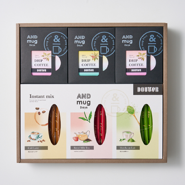 | 内容 | ドリップパック(アロマブレンド3P×2個、深煎りブレンド3P×1個)、インスタントスティック(泡立ちカフェラテ・ロイヤルミルクティー・泡立ち抹茶オレ×各5本) |