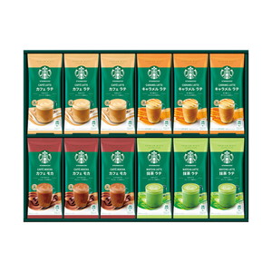 スターバックスのマグカップと本格ラテのセット。カフェラテとキャラメルラテ各4包入りで、自宅で手軽にカフェ気分を楽しめます。コーヒータイムを華やかに彩る、コーヒー好きの方への贈り物に最適なギフトです。