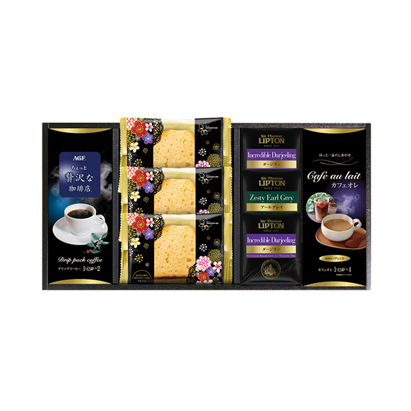 | 内容 | AGFちょっと贅沢な珈琲店スペシャルブレンド(7g×2)・サー・トーマス・リプトン アールグレイティーバッグ2.1g・カフェオレ(12g×4)×各1、サー・トーマス・リプトン ダージリンティーバッグ2.2g×2、金澤兼六製菓オリジナルケーキ(プレーン)×3 |