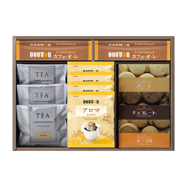 | 内容 | ドトールドリップコーヒーアロマブレンド7g・ドトールカフェ・オ・レ9.5g×各4、ダージリン紅茶ティーバッグ2.5g・アッサム紅茶ティーバッグ2.5g・ニルギリ紅茶ティーバッグ2.5g×各5、メープルクッキー50g・チョコクッキー50g・バニラクッキー50g×各1 |