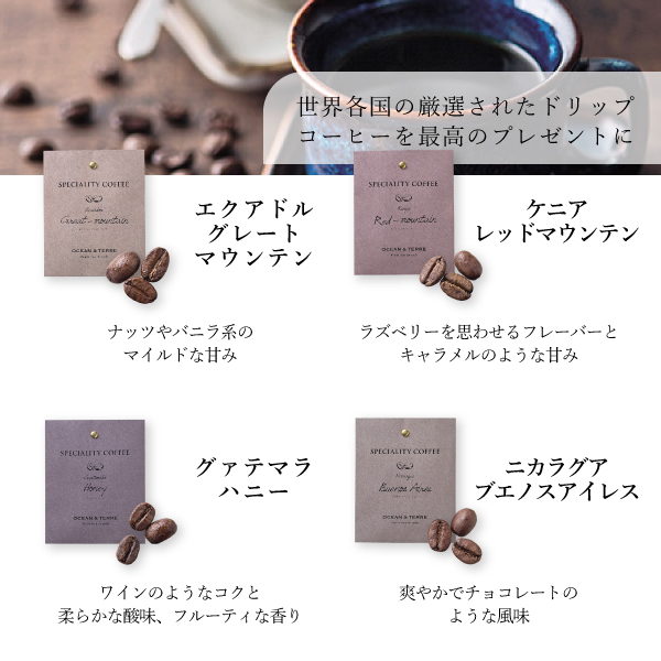 | 内容 | ドリップ珈琲(ミャンマー スターマウンテン、ブラジル ショコラ、コスタリカ ハニー、エチオピア イルガチェフェ、インドネシア ガヨマウンテン、コロンビア ヴィラファティマ、メキシコ オアハカオーロラ、タンザニア ハニー、エクアドル グレートマウンテン、ケニア レッドマウンテン、グァテマラ ハニー、ニカラグア ブエノスアイレス)12種(各8g×1)、パスポート付き(スペシャルティコーヒー説明書) |