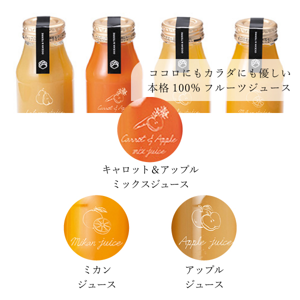 ココロにもカラダにも優しい本格100% フルーツジュースのセットです。「アップルジュース」「ミカンジュース」「キャロット&アップルミックスジュース」の美味しい3種類。見た目にも鮮やかで美味しそうなドリンクの贈り物はご夫婦や子供のいる家庭にも、一人暮らしの方にもおすすめです。日本の自然の恵みをシンプルに伝える「OCEAN&TERRE」が贅沢な時間をお届けします。シンプルなパッケージも人気のギフトです。