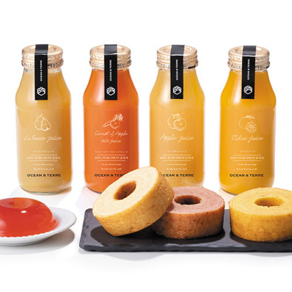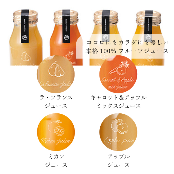 ココロにもカラダにも優しい本格100% フルーツジュースのセットです。「アップルジュース」「ミカンジュース」「ラ・フランスジュース」「キャロット&アップルミックスジュース」の美味しい4種類。見た目にも鮮やかで美味しそうなドリンクの贈り物はご夫婦や子供のいる家庭にも、一人暮らしの方にもおすすめです。日本の自然の恵みをシンプルに伝える「OCEAN&TERRE」が贅沢な時間をお届けします。シンプルなパッケージも人気のギフトです。