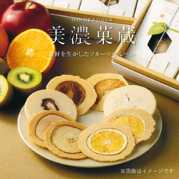 フルーツを練り込んだ生地に、新鮮なフルーツを丸ごとスライスしてトッピングし、香ばしく焼き上げたせんべいとゴーフレット。口に入れた時の「せんべい」とは思えない香りと、 フレッシュな味わいを堪能ください。自然に恵まれた美濃の地から、シンプルに、まっすぐに、素直に素材そのものの美味しさを感じる他にはないお菓子の詰め合わせです。