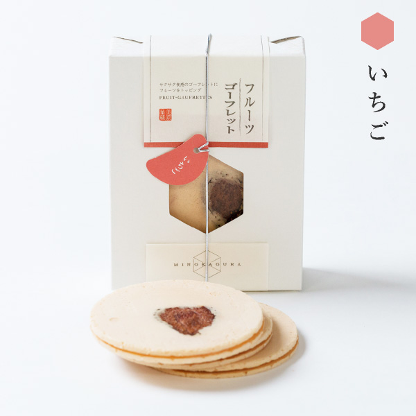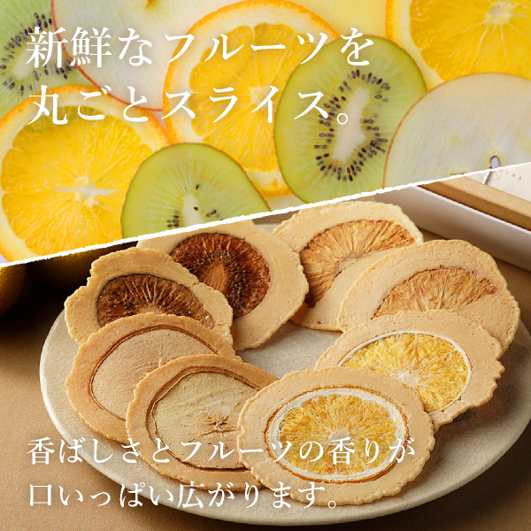 スライスした生のフルーツを生地に載せ、2枚の鉄板に挟んで薄く焼き上げる「はさみ焼き」の製法で作られています。口に入れると豊かなフルーツの香りが広がり、生地の香ばしさとフルーツの甘酸っぱさ、軽やかな歯ごたえが微笑みを運びます。