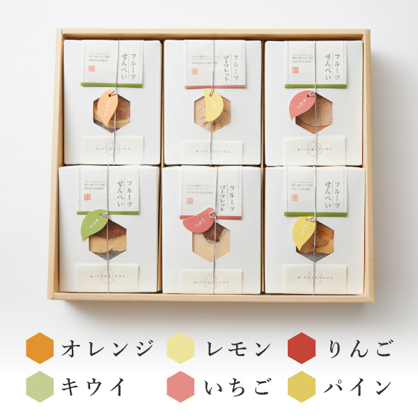 | 内容 | フルーツせんべい りんご・オレンジ・キウイ・パイン 各6枚 フルーツゴーフレット いちご・レモン 各5枚 |