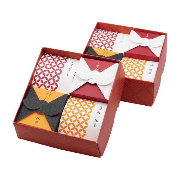 | 内容 | くず餅プレーン75g(別添黒蜜5g・きな粉5g)・くず餅抹茶75g(別添黒蜜5g・きな粉5g)・くずぷりんプレーン75g・くずぷりん抹茶75g×各2個 計8個 |