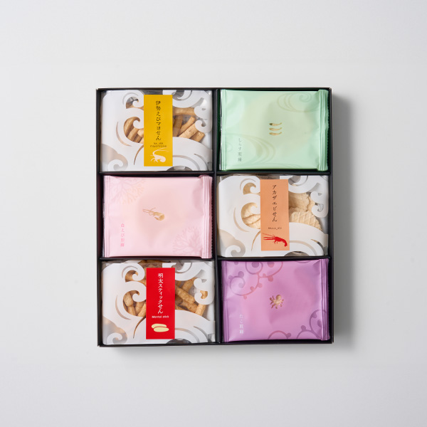 | 内容 | 白えび煎餅・たこ煎餅・しらす煎餅×各5枚、伊勢えびマヨせん:18g×1個、明太スティックせん:18g×1個、アカザエビせん:22g×1個 |